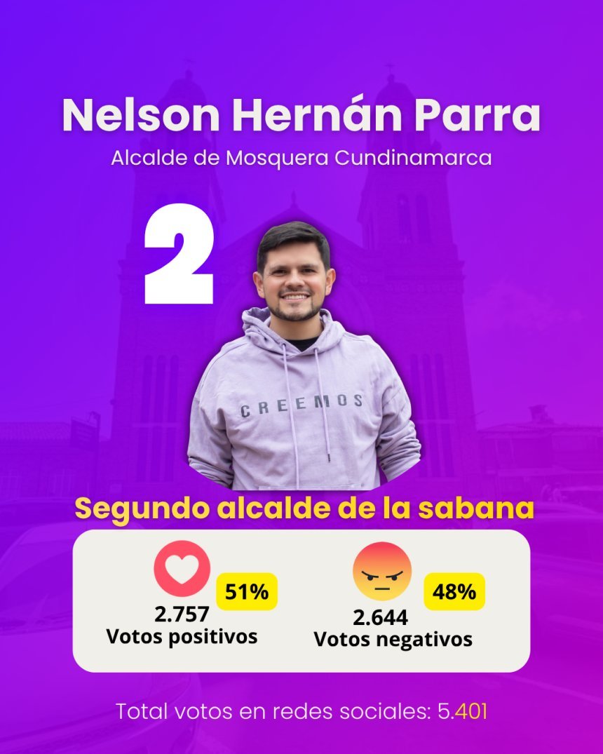 Con una votación reñida que le otorga un 51% de aprobación, el alcalde de Mosquera, Nelson Hernán Parra, se ubica en el segundo puesto, logrando mantenerse por encima del umbral positivo.
