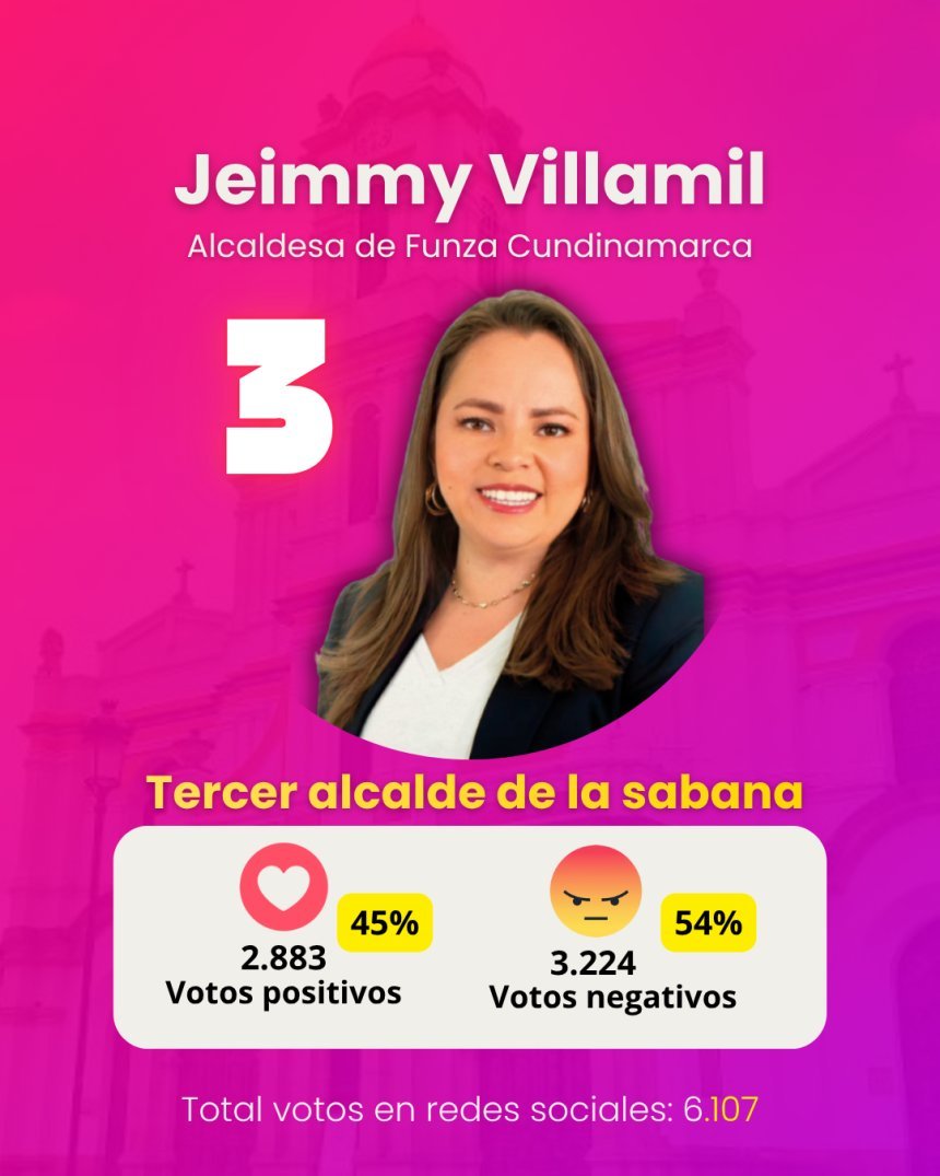 La alcaldesa de Funza, Jeimmy Villamil, se encuentra en un tercer lugar desafiante, con un 45% de votos positivos, siendo la primera de la lista con una desaprobación mayoritaria del 54%.