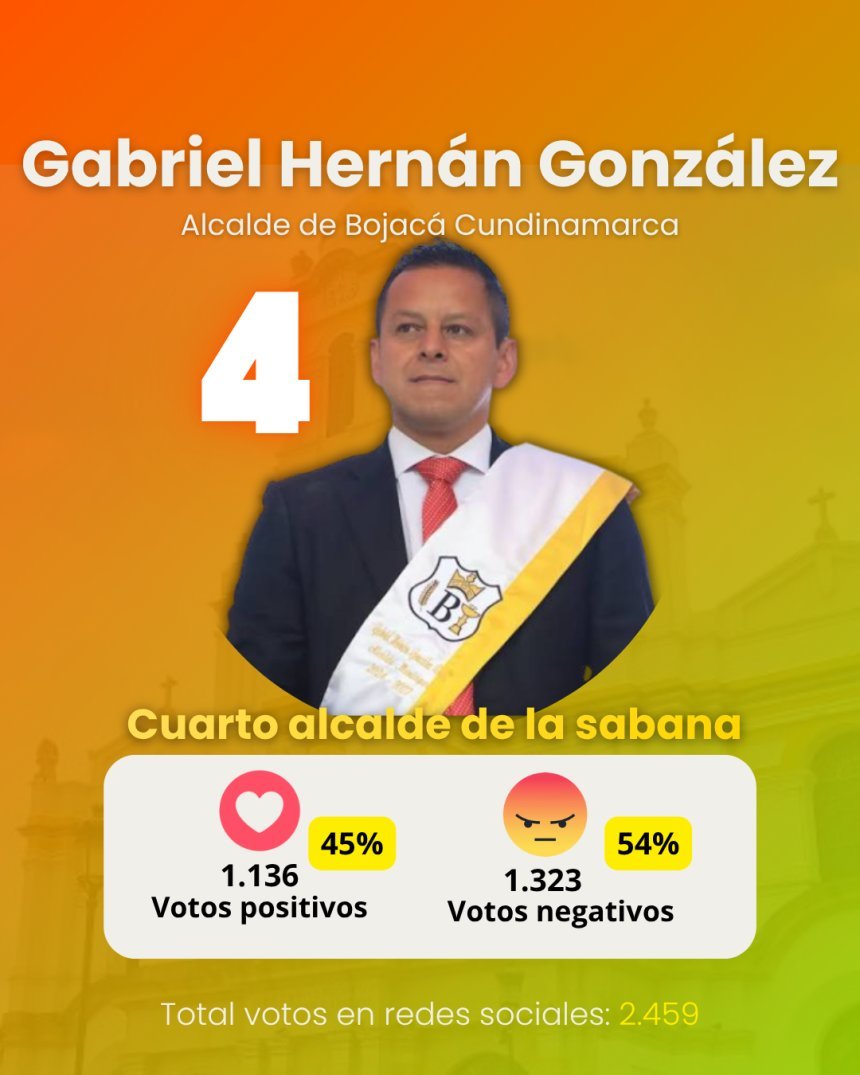 Con un porcentaje de aprobación idéntico al de Funza (45% positivo y 54% negativo), el alcalde de Bojacá, Gabriel Hernán González, se ubica en el cuarto lugar.