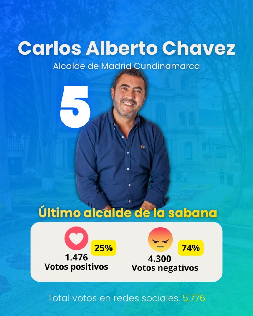El último lugar es para el alcalde de Madrid, Carlos Alberto Chávez, quien recibe la peor calificación con solo un 25% de aprobación y un demoledor 74% de desaprobación.